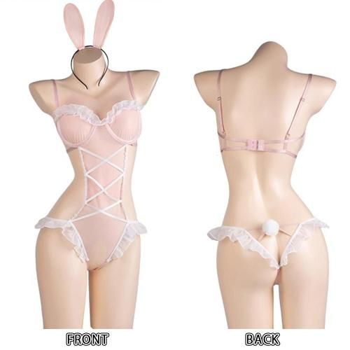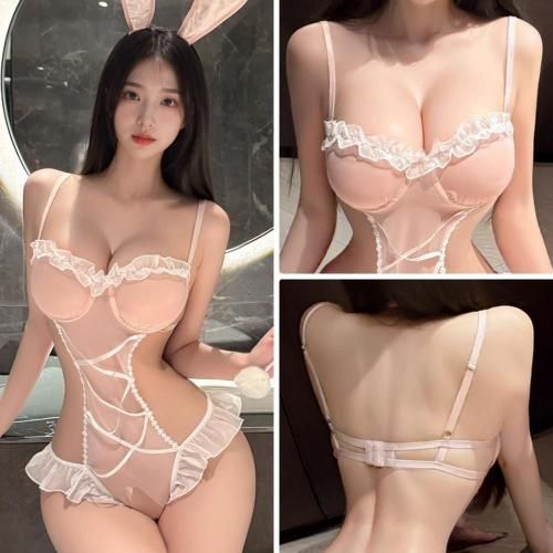 甘くヌーディーなロマンティック大人バニーガール風セクシーコスプレ(SEXYCOSPLAY)。素肌の艶を際立たせるピンクベージュに、フリルやレースをあしらったデザインのバニーガール風テディ。肌をふんわりと幻想的に透過させるエアリーなシースルーメッシュに、ロマンティックカラーが甘すぎない優雅で落ち着いた女性らしさを引き出し、着ているのに裸よりも官能的な魅力を放ちます。ブラはワイヤー入りでバストを下から支え、バストからウエストの曲線美を際立たせてグラマラスなラインを実現。また、オープンクロッチが大胆な露出と着脱の利便性を両立させ、無邪気な可愛らしさと背徳的な露出がバランスの良い一着。