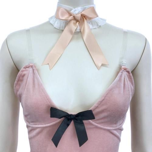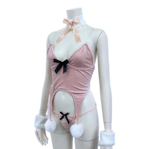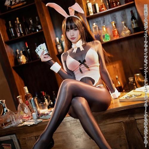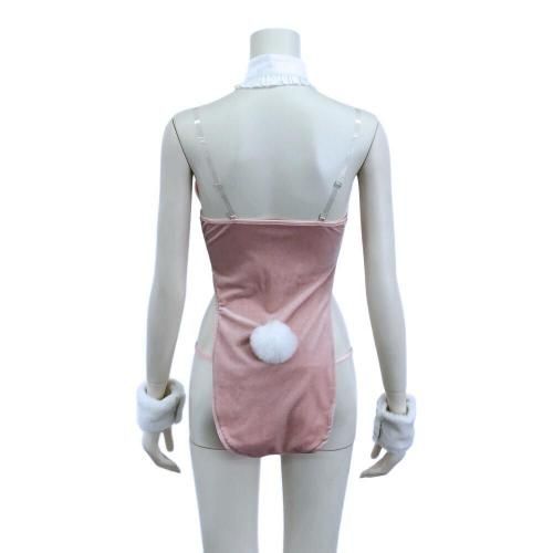 大胆に魅せつつもまるでマシュマロのようなバニーガール風セクシーコスプレ(SEXYCOSPLAY)。可愛らしいパステルピンクのベロア生地に、フワモコファーがまるでマシュマロのような触れたくなる柔らかデザイン♪丸みのある燕尾にしっぽを付けた可愛らしいバックスタイルとは対照的に、フロントデザインはウエストを逆U字にカットアウトし、先端にファーを付けることで動くたびに妖艶に揺れ下半身が大胆に露出。ブラックのリボンが全体を引き締め甘さの中にもクールさを感じるバニースーツには、コーディネートに網タイツやパンスト、さらにはボディスーツなどをインナーに合わせるなど変幻自在の楽しみ方もおすすめです♪