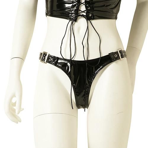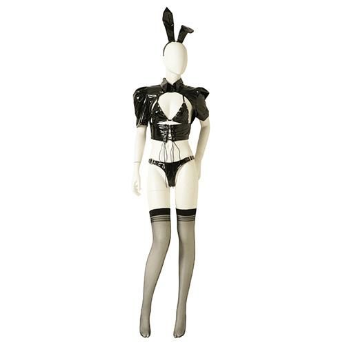 エナメルの光沢感がハードプレイを予感させるバニーガール風セクシーコスプレ(SEXYCOSPLAY)。伸縮性のあるストレッチエナメルで仕立てられたボンデージ感あふれるセット。通常布で覆われている部分とは逆に大胆に露出した【逆バニースーツ】をイメージ。デコルテから二の腕まで覆うトップスは逆に隠すべきバストを大胆に露出し、インナーの三角ビキニがパートナーの視線を釘付けに。ボンデージ感溢れるスタッズや拘束着のようなベルトパーツやレースアップなどいつもの可愛らしいバニーとはひと味違うピリッとしたスパイスを効かせたディテールにも注目です。コスチュームには脚先までフェティッシュな雰囲気を漂わせるストッキングをセットにしてお届けします。