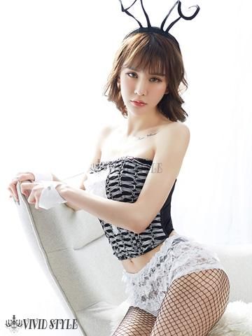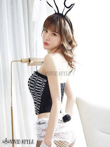レース生地にシフォン素材のレースアップがキュートなバニーガール風セクシーコスプレ(SEXYCOSPLAY)。前身頃にはシフォン素材のリボンで細かくレースアップがあしらわれ胸元にはスカラップレースのフリルがたくさん付いたキュートなトップスは、短め丈のコルセット風デザインで背中のホックは10個留め3段階調節可能なのでキュッと締めればボディラインを細く着痩せして見せるスタイルアップ効果アリ♪ヒップに付けられた小ぶりのシッポが可愛いショートパンツは、胸元と同じレースを使用することで程良い透け感がありキュートさの中にもセクシーさを演出する無敵の大人キュートなデザインです。