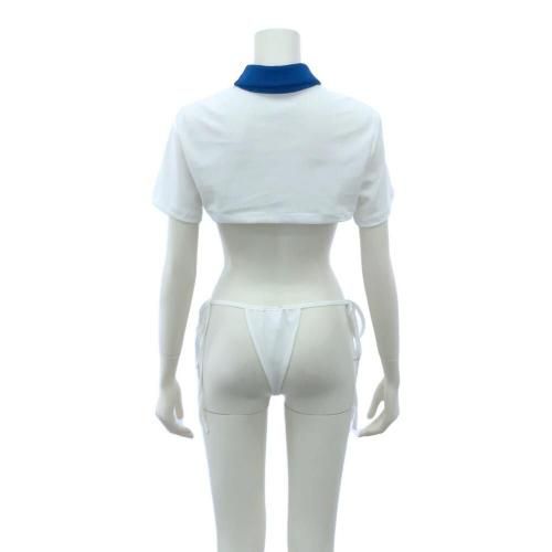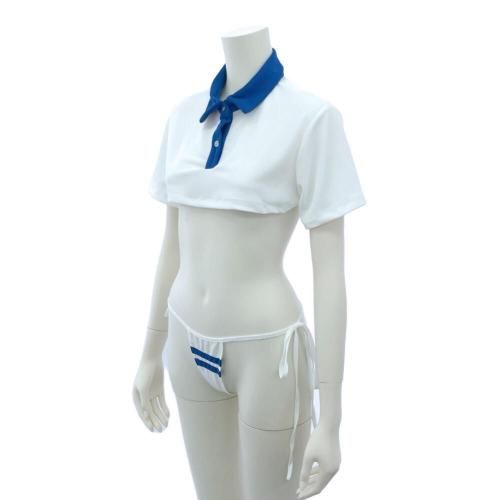 大人になった今だからこそ夢が叶う体操着風セクシーコスプレ(SEXYCOSPLAY)。部活で?いた汗の香りが懐かしく、青臭い青春の日々が蘇る白とブルーのさわやかな体操着コスプレ。究極までショート丈にしたポロシャツのアンダーからは下乳が覗き、スポーティラインが入った超ハイレグのサイドストリングショーツからは、ヒップが大胆に露出。ショーツのストリングを解く指先に抑えられない欲望が伝わる。また、セットのニーハイストッキングは、見た目の可愛らしさだけではなく触覚からも刺激を受ける隠れた名脇役。大人の時間を存分に楽しんで♪
