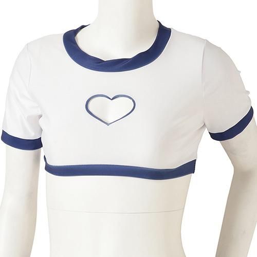 際どい超ミニ丈が視線を集中させる体操服風セクシーコスプレ(SEXYCOSPLAY)。伸縮性が高い生地で身体にピタッとフィットする生地を使用したリンガーデザインのミニ丈トップスはバストにチャーミングなハートをくり抜くことによりバストがチラリと見え、着丈の短さで動くとバストラインが露出しパートナーの興奮を誘うアイテムです。ブルマはヒップが露出するTバックタイプで爽やかなスポーティーさをプラス。セットのニーハイソックスは足先まで魅力的に演出します。