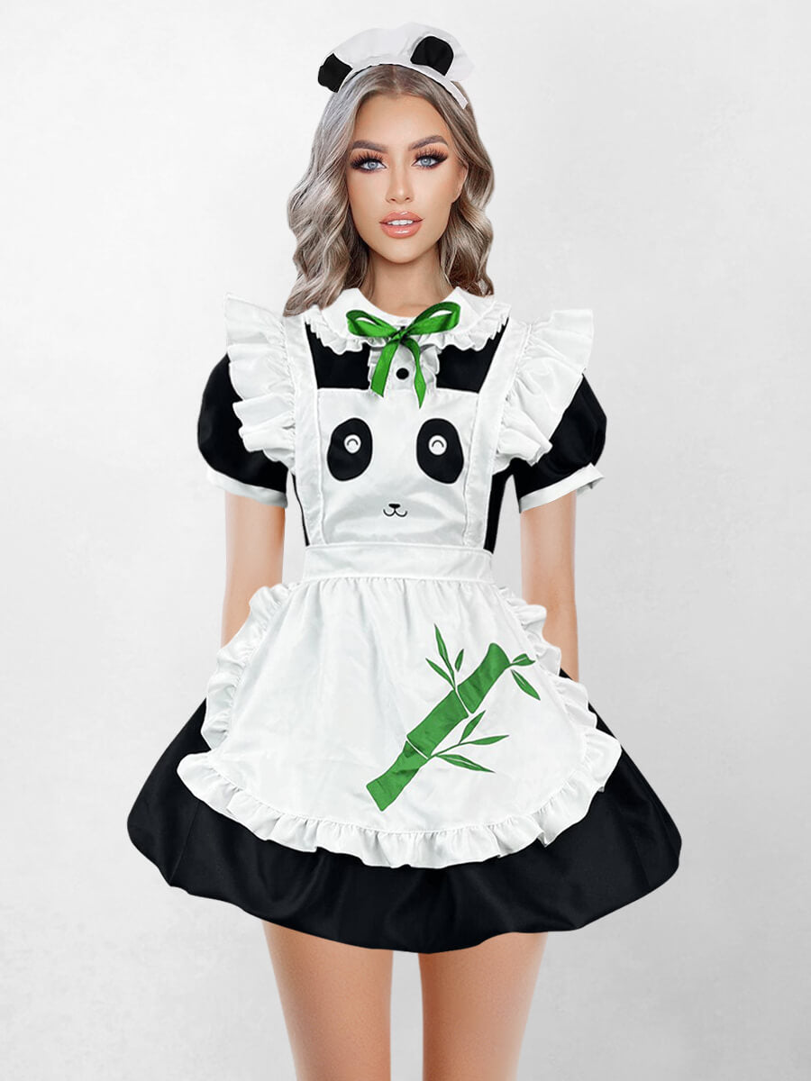 Design: Cute cow print costume featuring a maid top with off shoulder, a tie front details, puff short sleeve, an attached apron with tie back closure, and white pleated mini skirt.