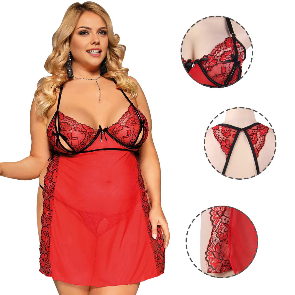 Women Plus Size Elegant Passion Red Sheer Mesh Babydoll.the halter neck design of this teddy lingerie adds a touch of elegance, while the butterfly lace detailing creates a unique and sophisticated look. This design element makes the teddy lingerie stand out from other lace lingerie products.