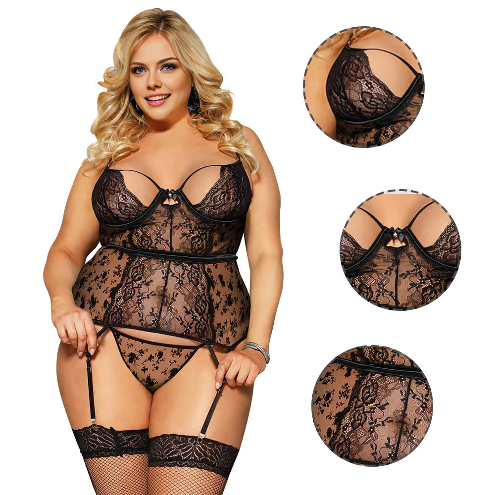 Women Plus Size Exquisite Lace Garter Floral Lace Babydoll