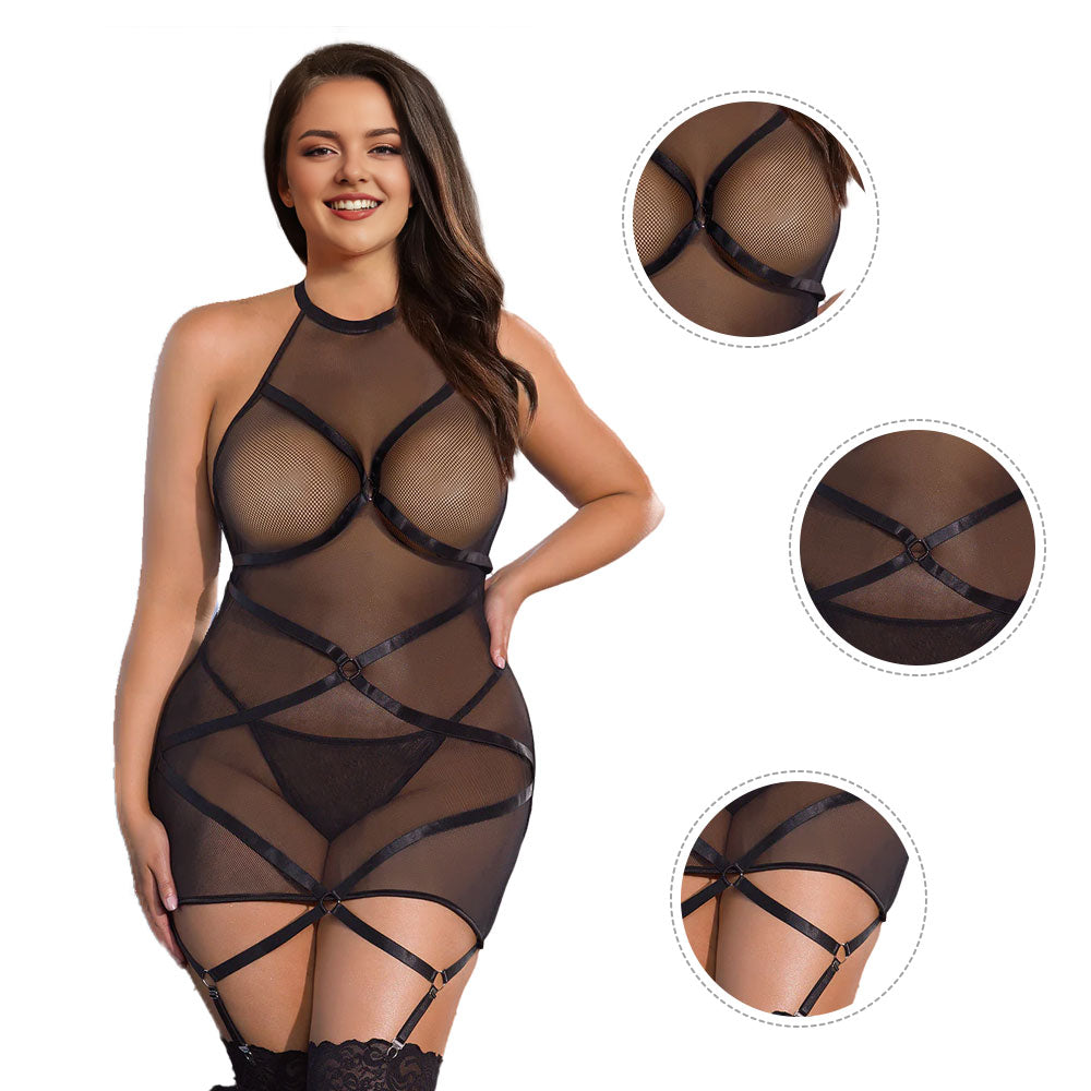 Women Plus Size Black Halter Neck Mesh Bondage Sexy Garter Lingerie designed to celebrate your curves and highlight your bold side. Featuring seductive bondage-inspired details, sheer mesh fabric, and a halter neckline, this piece perfectly combines allure and confidence. The attached garters add a playful and daring edge, making it ideal for romantic nights or to make a powerful statement.