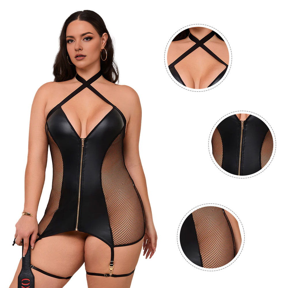 Women Plus Size Black Mesh PU Leather Deep V-Neck Halter Sexy Lingerie deep V-neckline paired with a halter tie emphasizes the bust and adds a touch of allure.The black sheer mesh combined with PU leather creates a layered look that is both elegant and provocative.