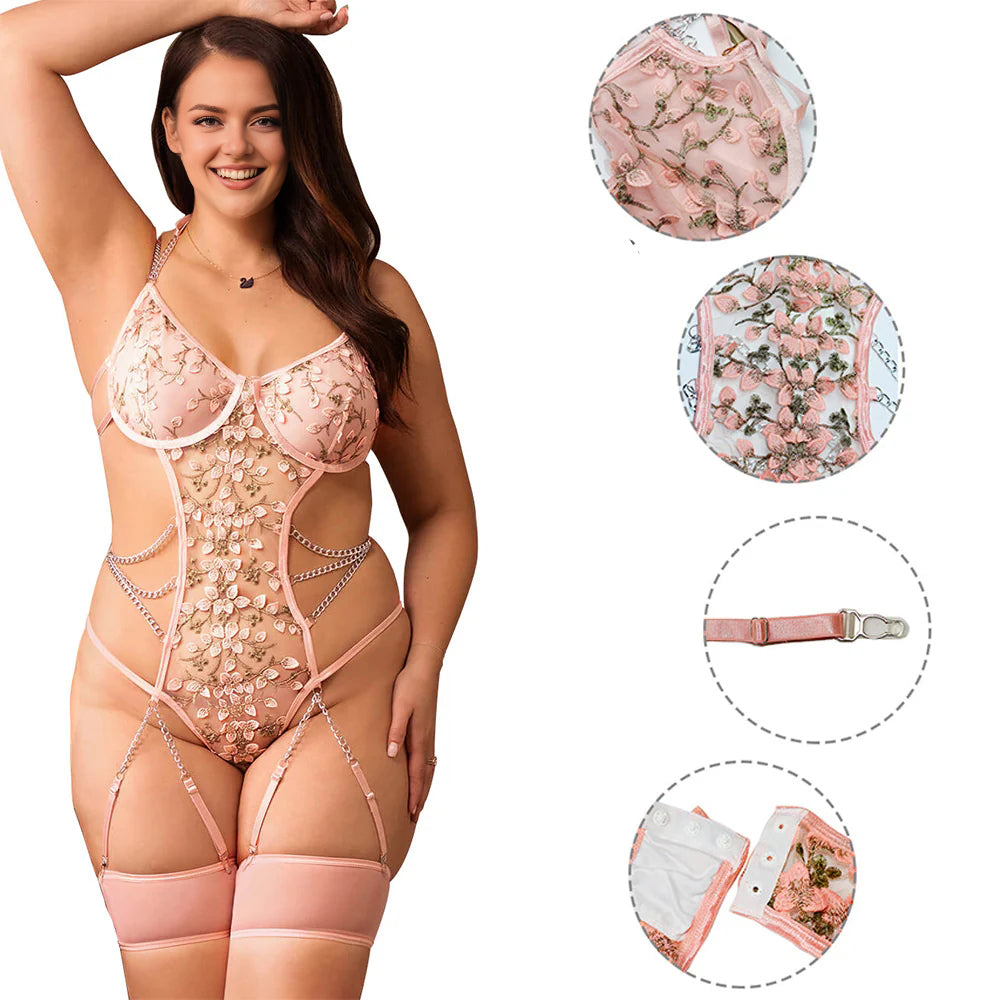 Women Plus Size Garter Bodysuits is part of the Plus Size Bodysuit. This teddy bear is perfect for a romantic evening, a sexy boudoir photo shoot, or as part of a provocative cosplay costume. With its beautiful embroidery, stylish chain, and adjustable features, this teddy bear is a must-have addition to any lingerie collection.