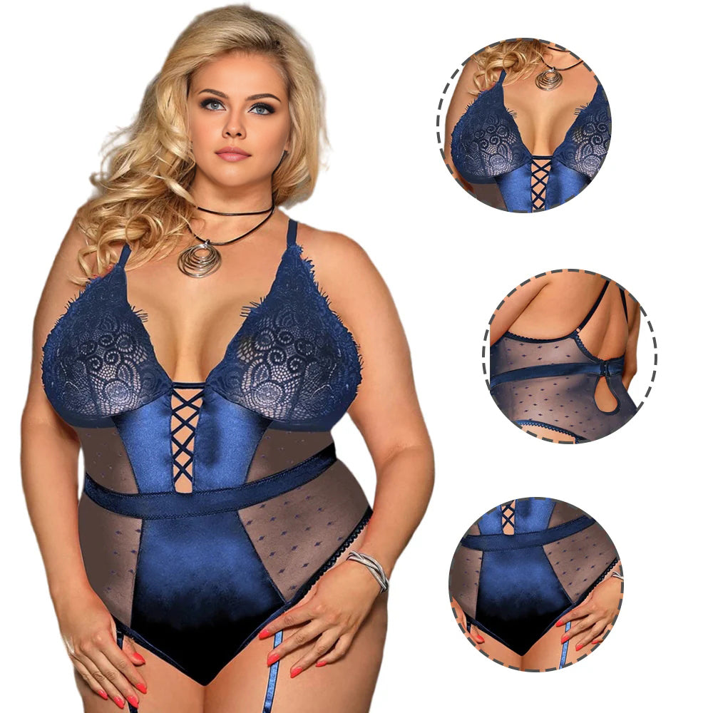Women Plus Size Black Lace Sexy Transparent Bodysuit.This underwear is designed to make you feel confident, sexy and empowered. It has several irresistible features, including lightweight mesh fabric, eyelash lace, crossover shoulder strap design, adjustable shoulder straps and unique waist belt design. Let's take a closer look at each of these features.