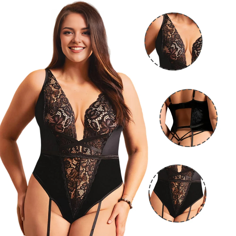 Women Plus Size Floral Embroidery Lace Bodysuit.A classic and elegant garment combining the softness of velvet and the sophistication of lace. This outfit features a deep V neckline that adds a touch of elegance and glamour. The garment has a row of hooks on the back, which can be adjusted to fit the bust, while the waist has multiple elastic bands with decorative buckles, giving it a unique and stylish look. The suit also features four elastic garter straps to prevent slipping and enhance the overall look.