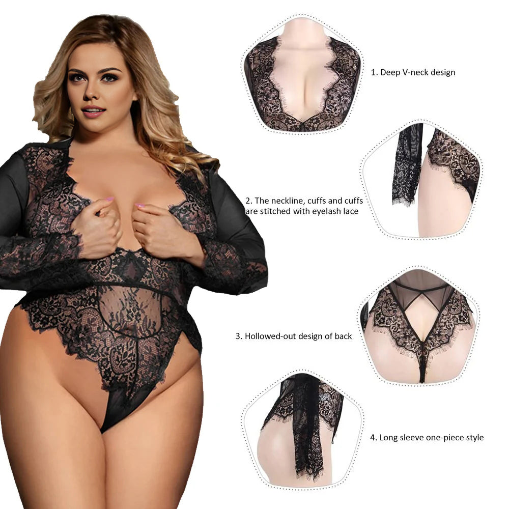 Women Plus Size Navy Exquisite Lace Sleeve Teddy This gorgeous bodysuit features a deep V neckline, eyelash lace trim and playful back cutout for a look that's as sophisticated as it is glamorous.Use lash strips. Lace is combined with mesh for a premium look that is both unique and elegant. Lace is used to accentuate the neckline, cuffs and ankle openings, adding a luxurious touch to the bodysuit.