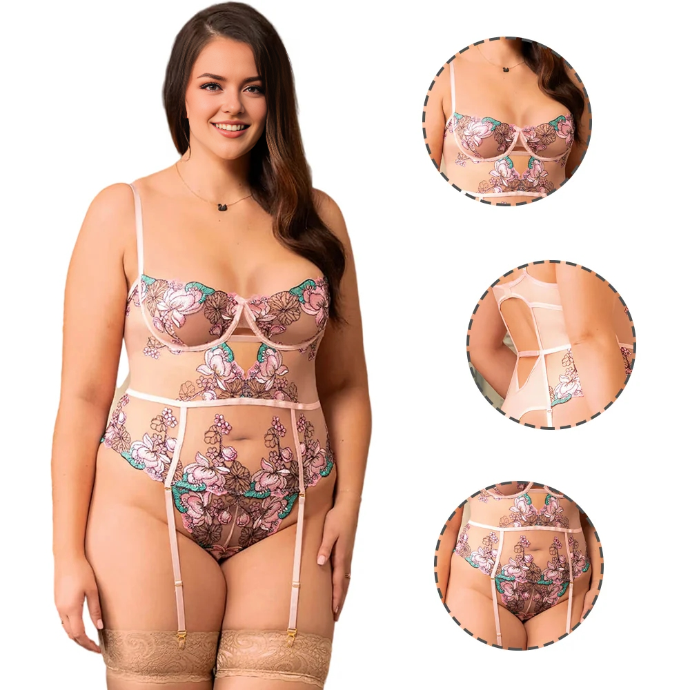 Women Plus Size Sexy Lace Suspenders Bodysuit Made of high-quality sheer mesh fabric with intricate embroidery. This embroidery adds a touch of sophistication and luxury to the lingerie, making it stand out from other products in the market.