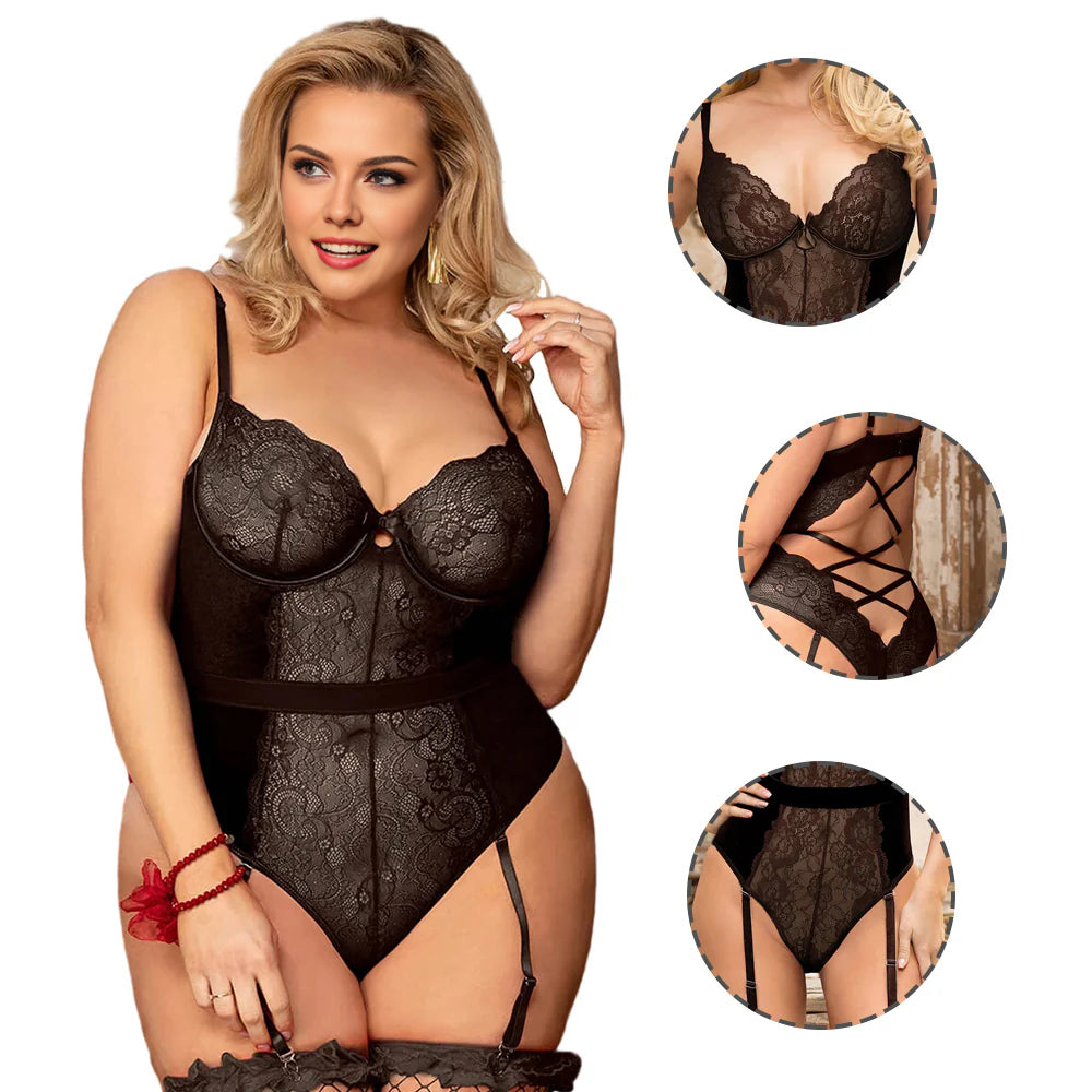 Women Plus Size Sheer Lace Bodysuit is part of the Plus Size Bodysuit. The ultimate lingerie for those who want confidence, comfort and sexy. Its underwire rings, adjustable straps and garter belt make it the perfect erotic bodysuit that stands out. So don't wait any longer, order yours today and experience the ultimate in comfort, support and style!