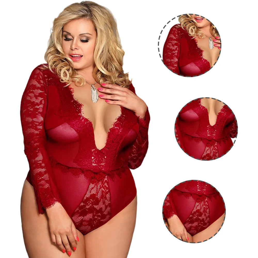 Women Plus Size V Neckline Plus Size Long Sleeves Bodysuit is part of the Plus Size Bodysuit. A must-have for any woman looking for comfortable, sophisticated and sexy lingerie options. Featuring eyelash lace and mesh, a plunging V neckline, waist detail and swimsuit fabric trim, this bodysuit is sure to be a must-have addition to any lingerie collection.