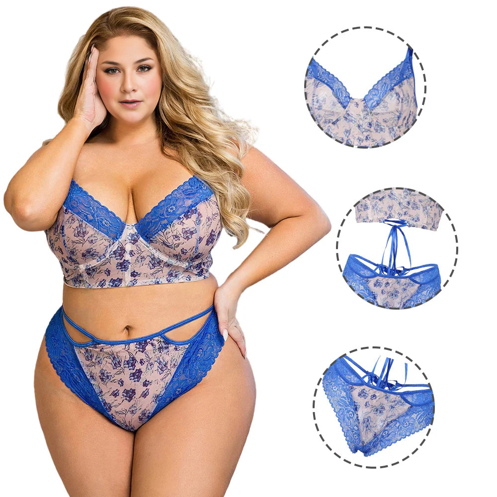 Women Plus Size Floral Lace Sexy Sheer Bra Set is part of the Plus Size Bra Set. With its skin-colored mesh, steel ring design, criss-cross strap back and waist, and combination of blue lace, this Bra Set is sure to impress. So, whether you wear a standard size or need a plus size, don’t hesitate to add this amazing piece of lingerie to your collection today!