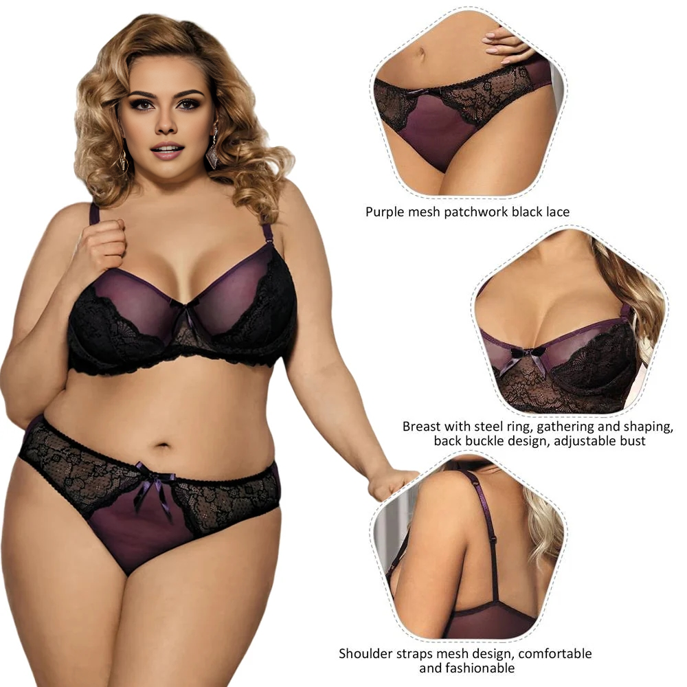 Women Plus Size Lace Mesh Panel Sheer Bra Set Bra set In addition to the flattering design, this bra set features an underwire that enhances the shape and lift of the bust, giving the wearer the perfect cleavage they desire.