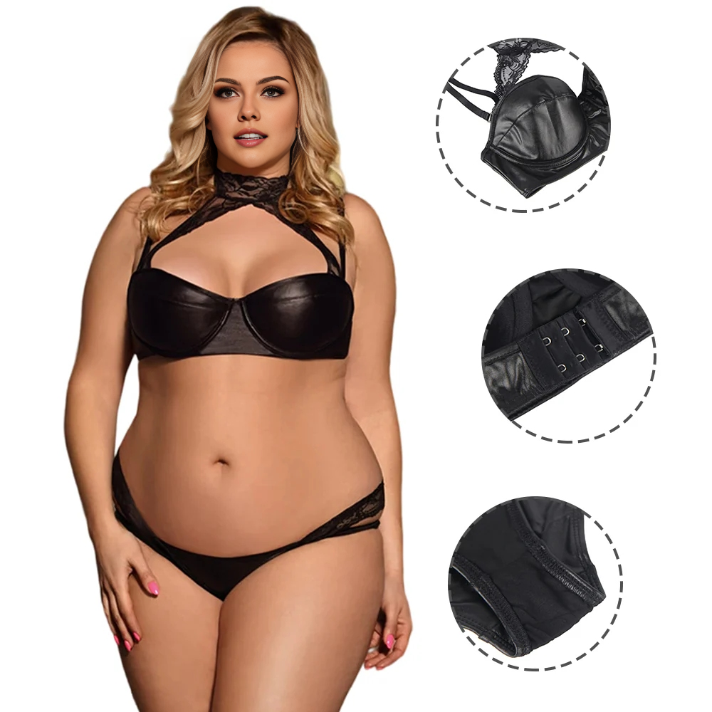 Women Plus Size Black Leather Lace Halter Bra Sets is part of the Plus Size Bra Set. It uses faux leather. The faux leather material is soft, comfortable, and durable, making it a great option for women who love the look of leather but prefer a more animal-friendly alternative.The sixth advantage of this bra set is the lace detail. The lace pattern on the halter strap and panties adds a touch of elegance and femininity to the overall design, perfect for women who want to feel sexy and sophisticated.