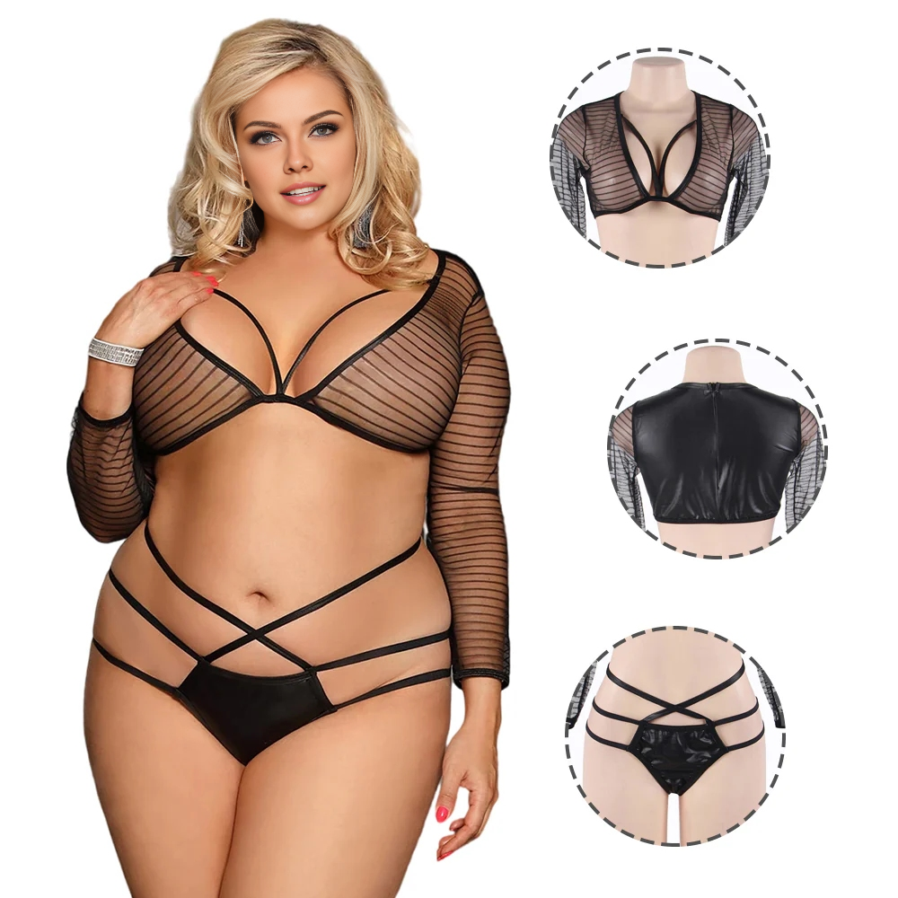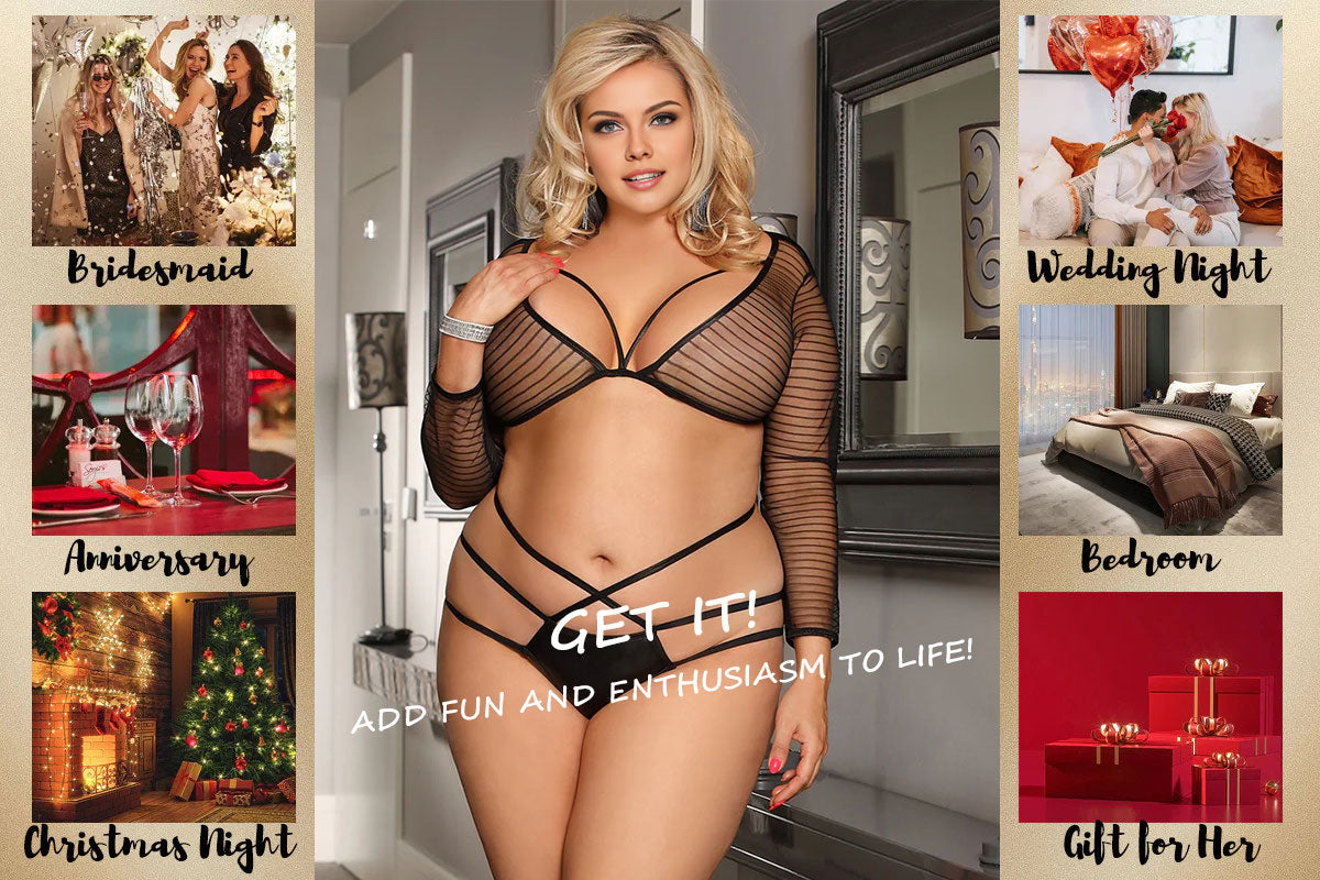 Women Plus Size Black Striped Lace Sexy Long Sleeve Bra Set.The bottom half of the lingerie set is just as impressive, with several elastic bands that can be adjusted for a unique and personalized fit. This design is perfect for those who want to feel comfortable and confident, making it the perfect choice for an evening or romantic evening.