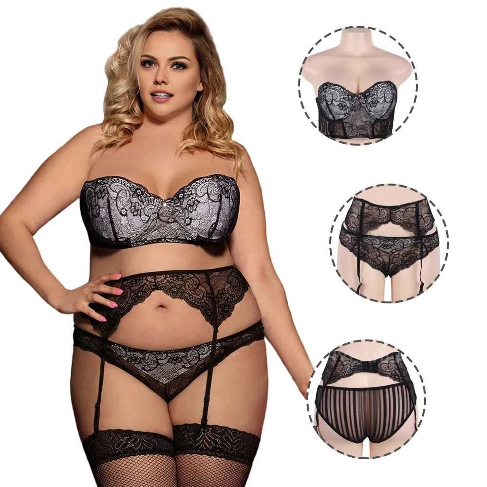 Women Plus Size Underwire Bra And Panty Set Garter Belts The lingerie set features a combination of mesh and lace fabrics to create a stunning and alluring look that is sure to turn heads. Mesh fabrics add a touch of elegance and sophistication, while lace fabrics add a touch of femininity and playfulness. The combination of fabrics creates a unique, eye-catching look that is perfect for any occasion.