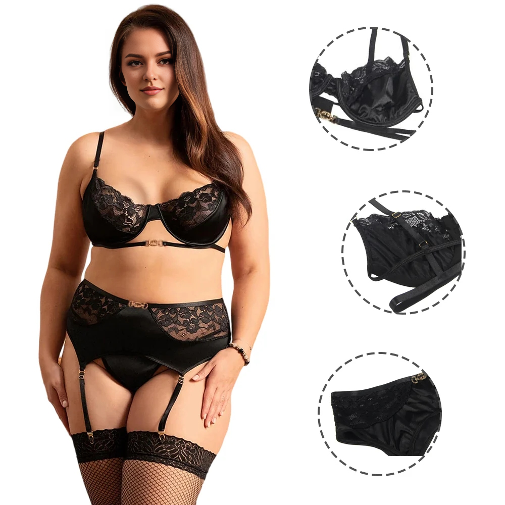 Women Plus Size Underwire Sexy Lace Bra Set The stretchy spandex material not only has a beautiful sheen, but feels like a second skin. This bra features an underwire that lifts and sculpts your breasts for a flatter, more natural look.