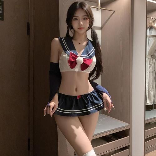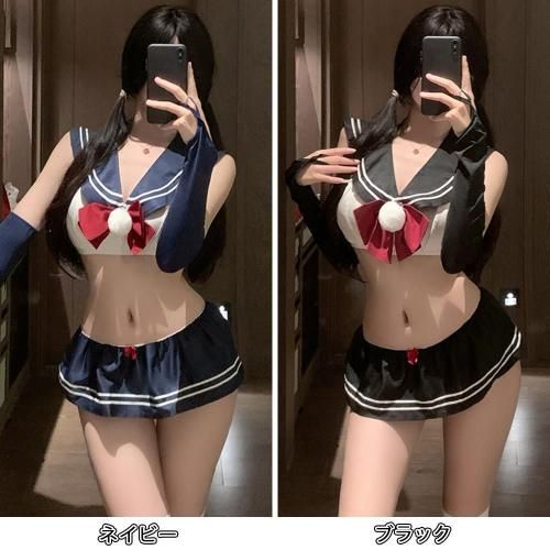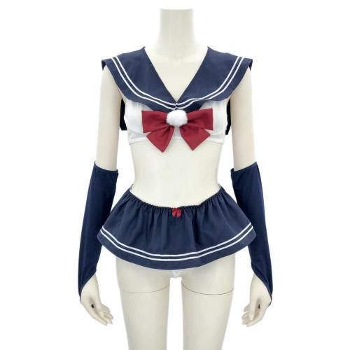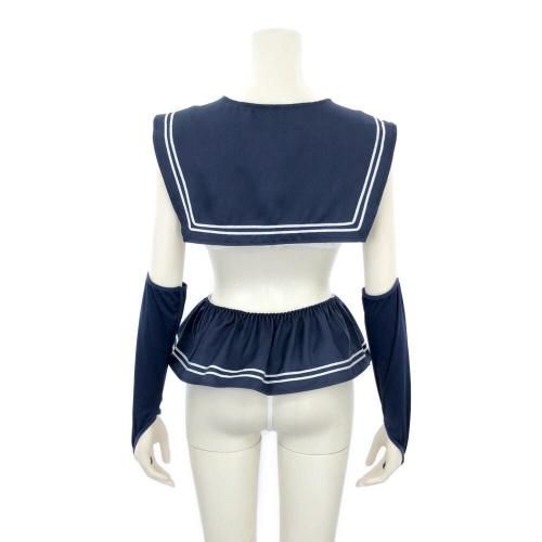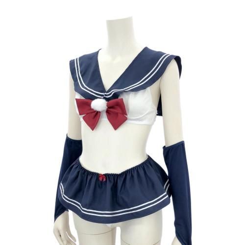 ミニ過ぎるスカートからヒップを大胆に露出した学生服風セクシーコスプレ(SEXYCOSPLAY) 。セーラーカラーがキュンと来るトップスは2列3段ホックで着脱しやすく、取り外せるポンポン付きの赤いリボンがアクセント。無邪気な少女らしさを感じつつもヒップ丸見えの大胆マイクロミニ丈スカートがちゃんとセクシーで、可愛らしさとセクシーさのバランスが◎長めのアームカバーが素肌とのコントラストを楽しめます♪フロントもバックスタイルも、どこから見ても抜け目のないデザインです。