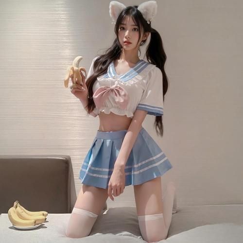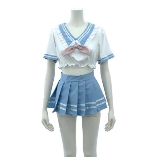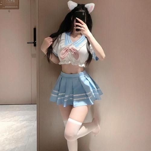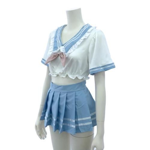 甘酸っぱくてキュートな猫耳セーラー服セクシーコスプレ(SEXYCOSPLAY) 。純白に淡いブルーが爽やかで、襟にフリルを施した幼さの残るキュートなセーラーコスプレ。ショートトップスのギャザーウエストがバストを強調し、可愛いだけではないセクシーな魅力を放ちます。プリーツミニスカートは着脱しやすいマジックテープで受け入れ態勢バッチリ♪そして鈴付きのふわふわねこ耳カチューシャを身に着ければ、気まぐれ猫ちゃんに可愛く変身できちゃう♪